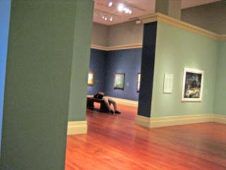 …and let us not forget (although we wish we could) sleeping—including the snoozer at the top of this post and this one, sprawled on a gallery bench:
